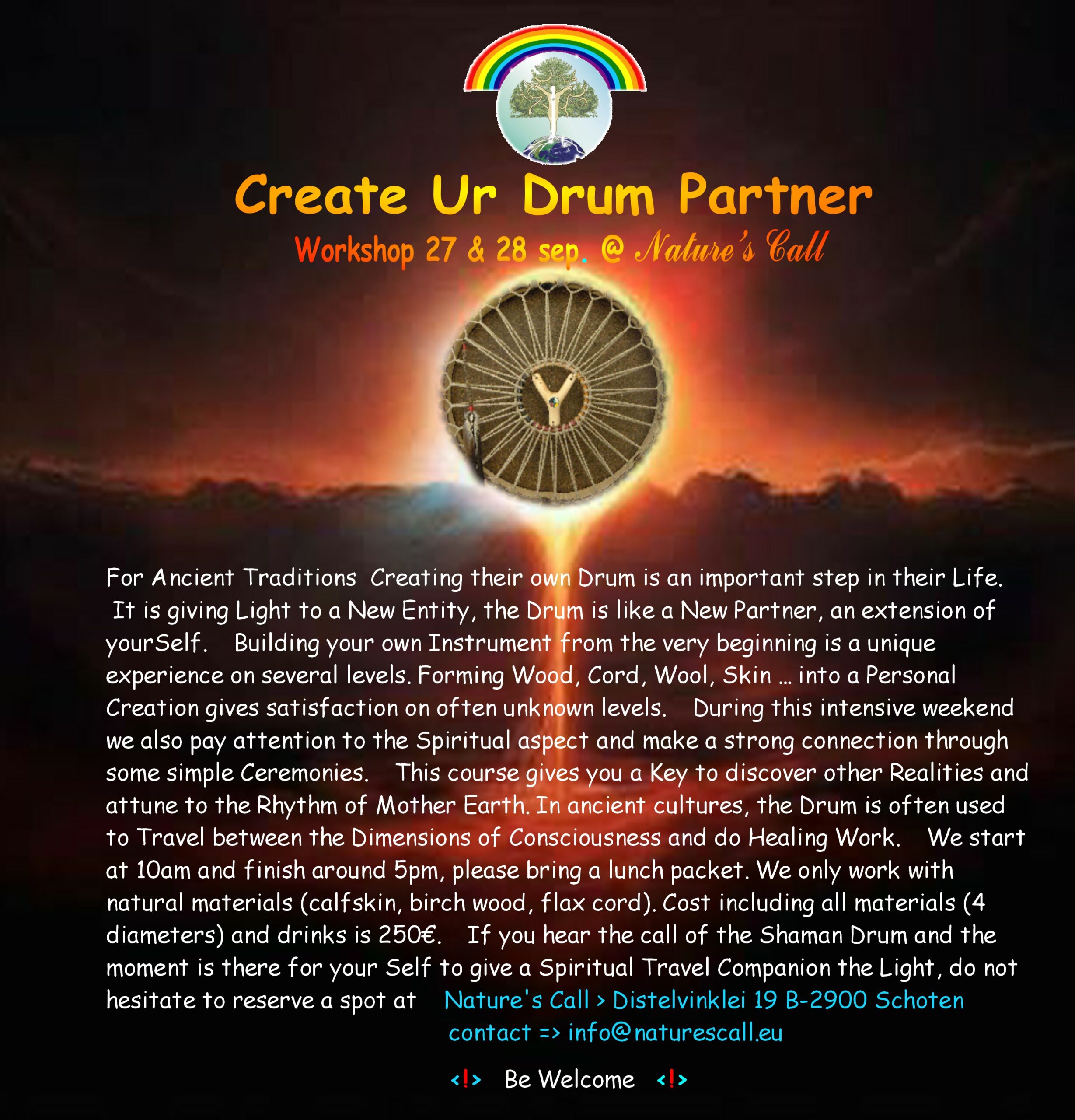 We are honored to have the possibility to offer you a workshop to create your own Drum. All over the globe we can find the use of different styles traditional Drums. It is said that this instrument represents the Heartbeat of Mother Earth and it can represent the first sound-rhythm we registrated, the Heartbeat of our own Mother. In many traditions the Drum is used to travel between the stages of consciousness, to contact Spirit Guides and Ancestors …. we have to give thanks to the old traditions that kept this instrument for us to use today.