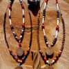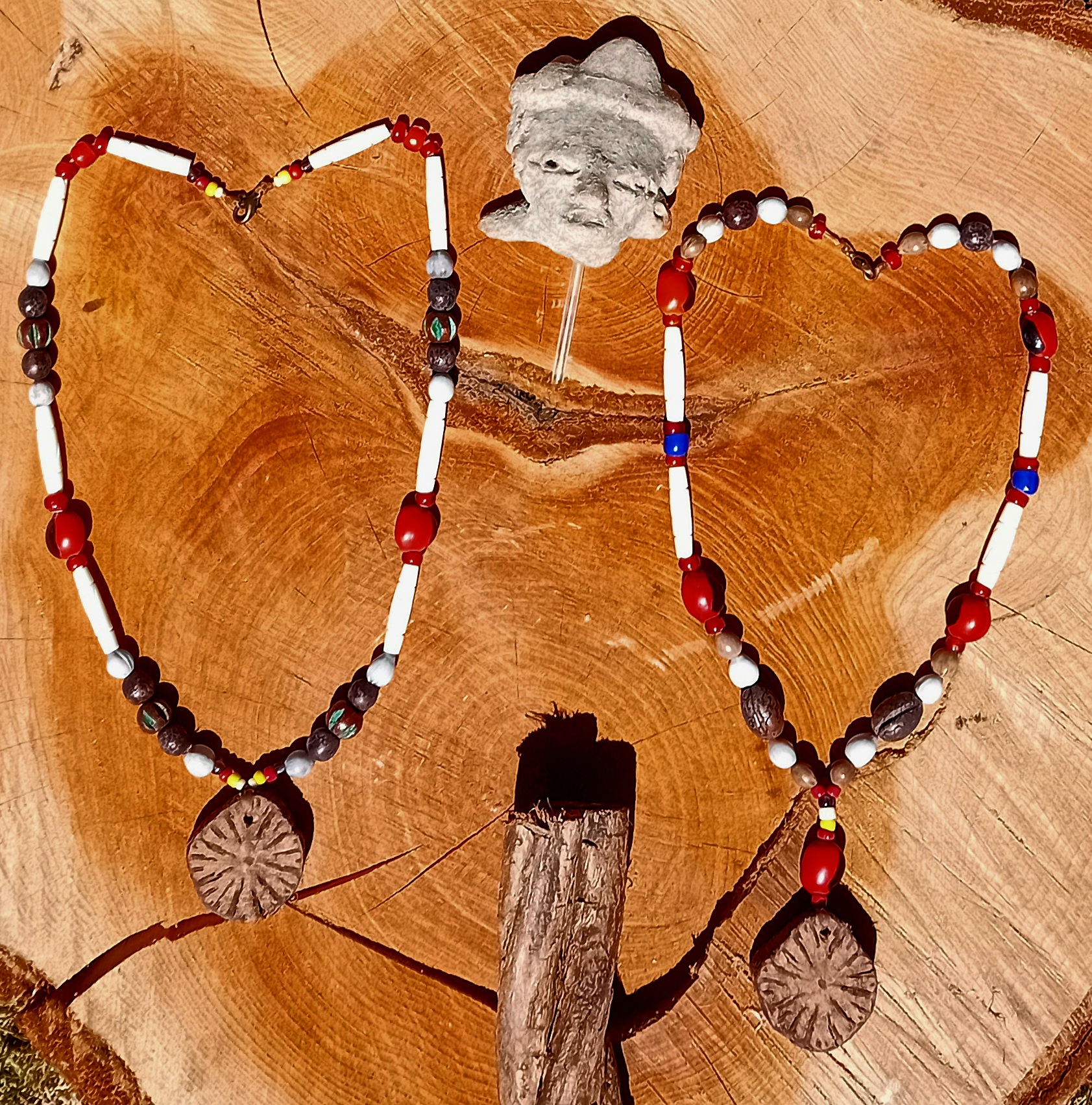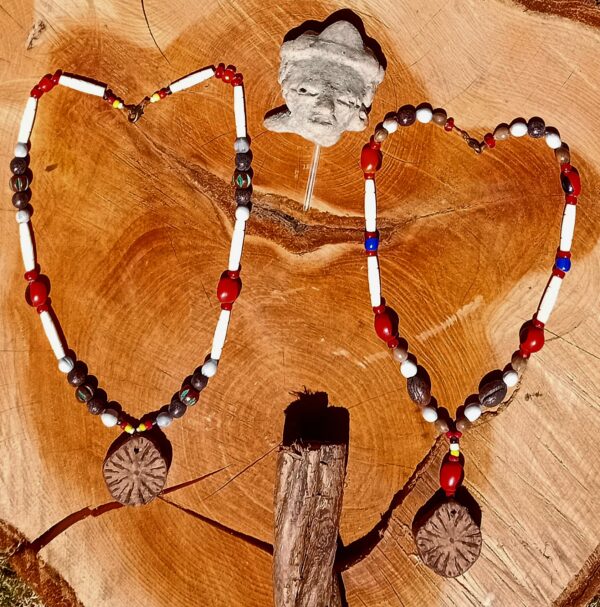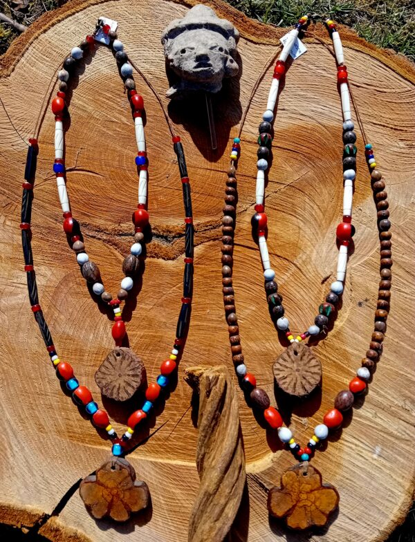 To the right you’ll see a necklace with a Caapi center piece combined also with Huayruro and Rosario seed beads, Bone pipes, wood and glass beads. Strung with sinew, closing with a lobster clasp. Another Unique Jewel measuring 44cm.