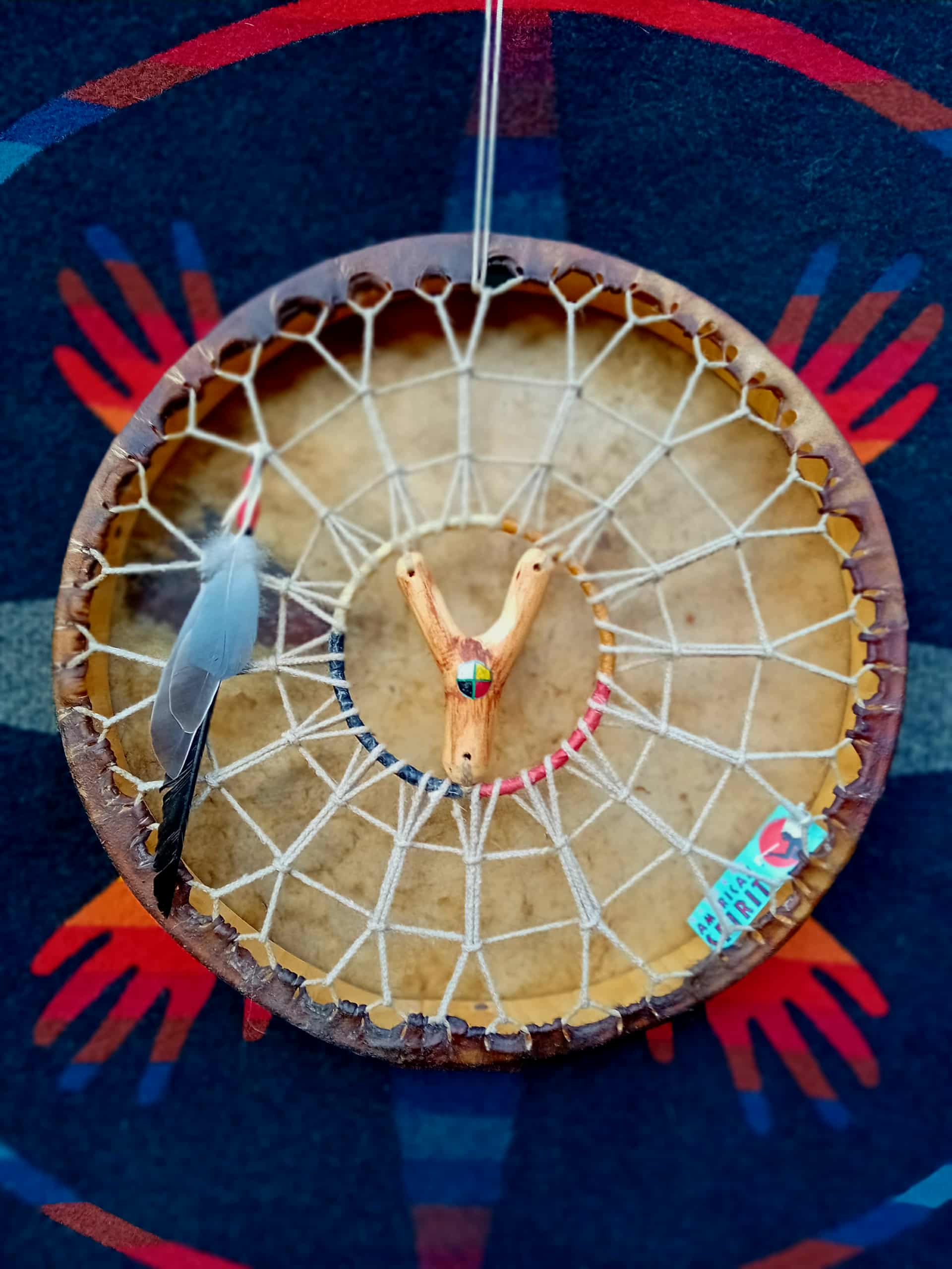 This model is made with a Birchwood frame and Hemp cord lacing. It has a wooden handle, sanded to a smooth touch to fit your hand perfectly. The handle has a handpainted Medicine Wheel symbol that depict the Four Directions. This Buffalo hide was completely worked by myself using only natural materials.