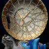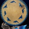This Goat hide Drum has Water symbols all around and 8 Dolphins swimming the surface. This unique Instrument is completely made by hand, the stunning decoration has 2 layers of varnish to protect the delicate design. It is laced with hemp robe, the wooden handle is sanded to a soft touch and has a handpainted Medicine Wheel symbol. The handle is set in an Iron ring, wrapped with cotton and drenched in Bees wax (sending Energy to the Bee People while drumming). Feathers wrapped in Buffalo hair give extra connection and empowerment. After finishing, the Drum had a soft massage with bio Almond oil to nourish and emphasize the structure of the skin. It’s also a way to pay respect to the Animal that gave us the materials to work with.