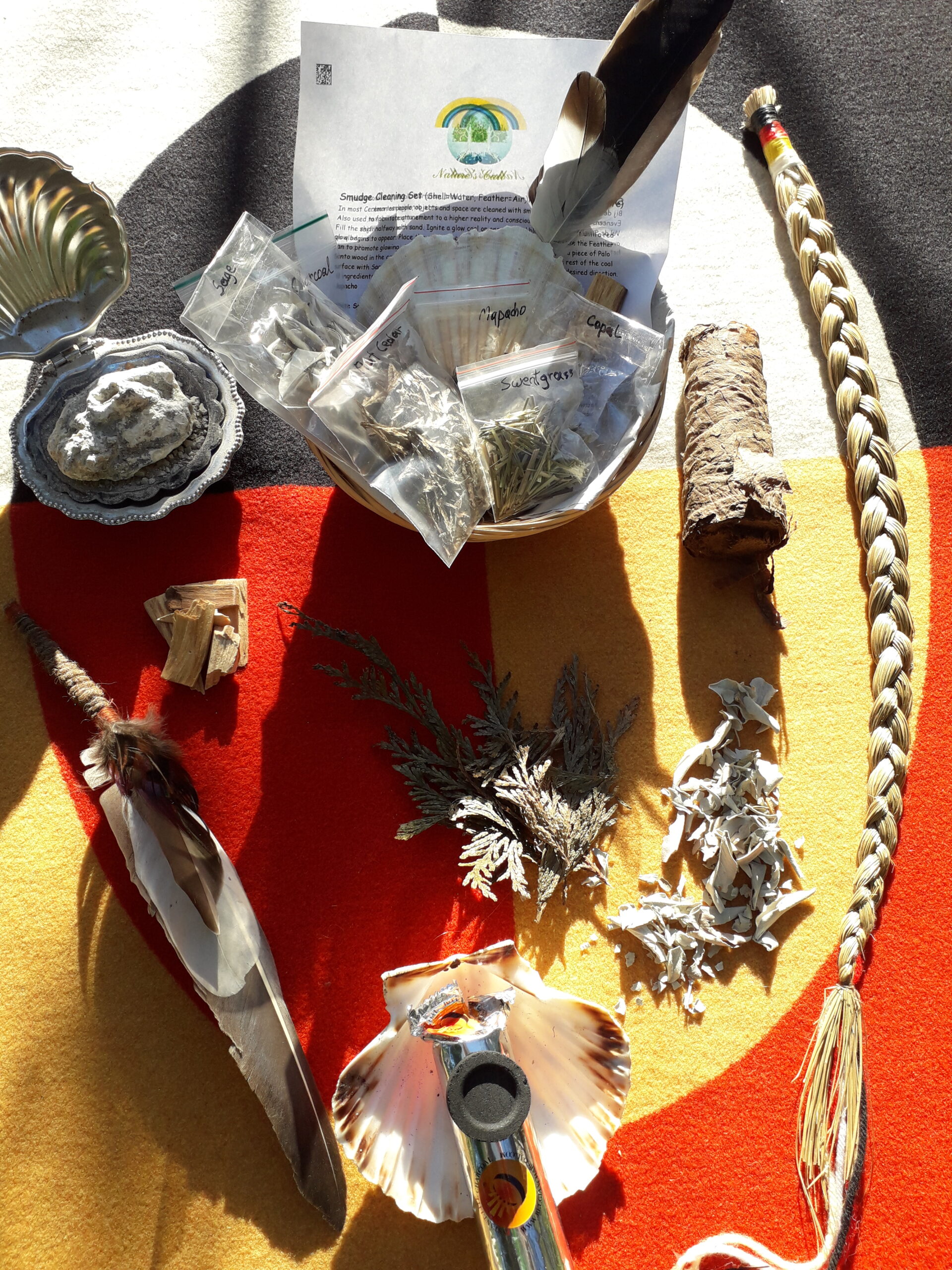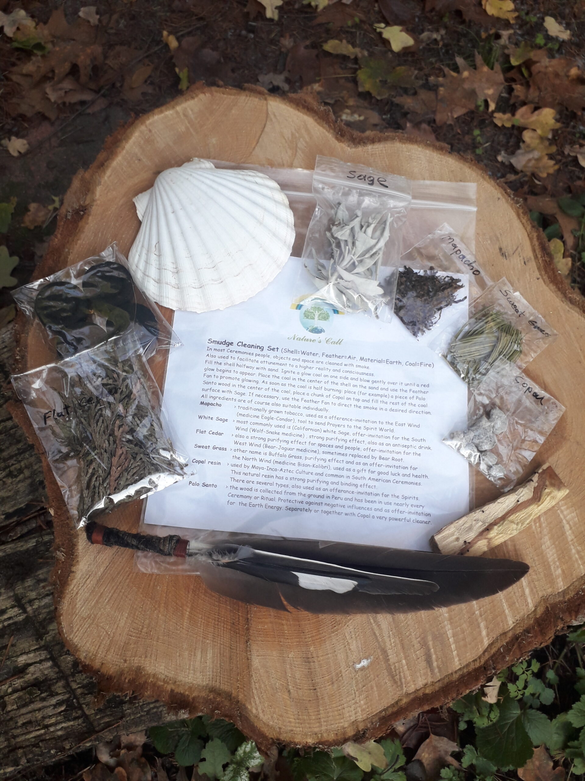 Various herbs, resins, wood and others are available for this. In our Smudge Set you can find the basics following North and South American tradition :