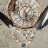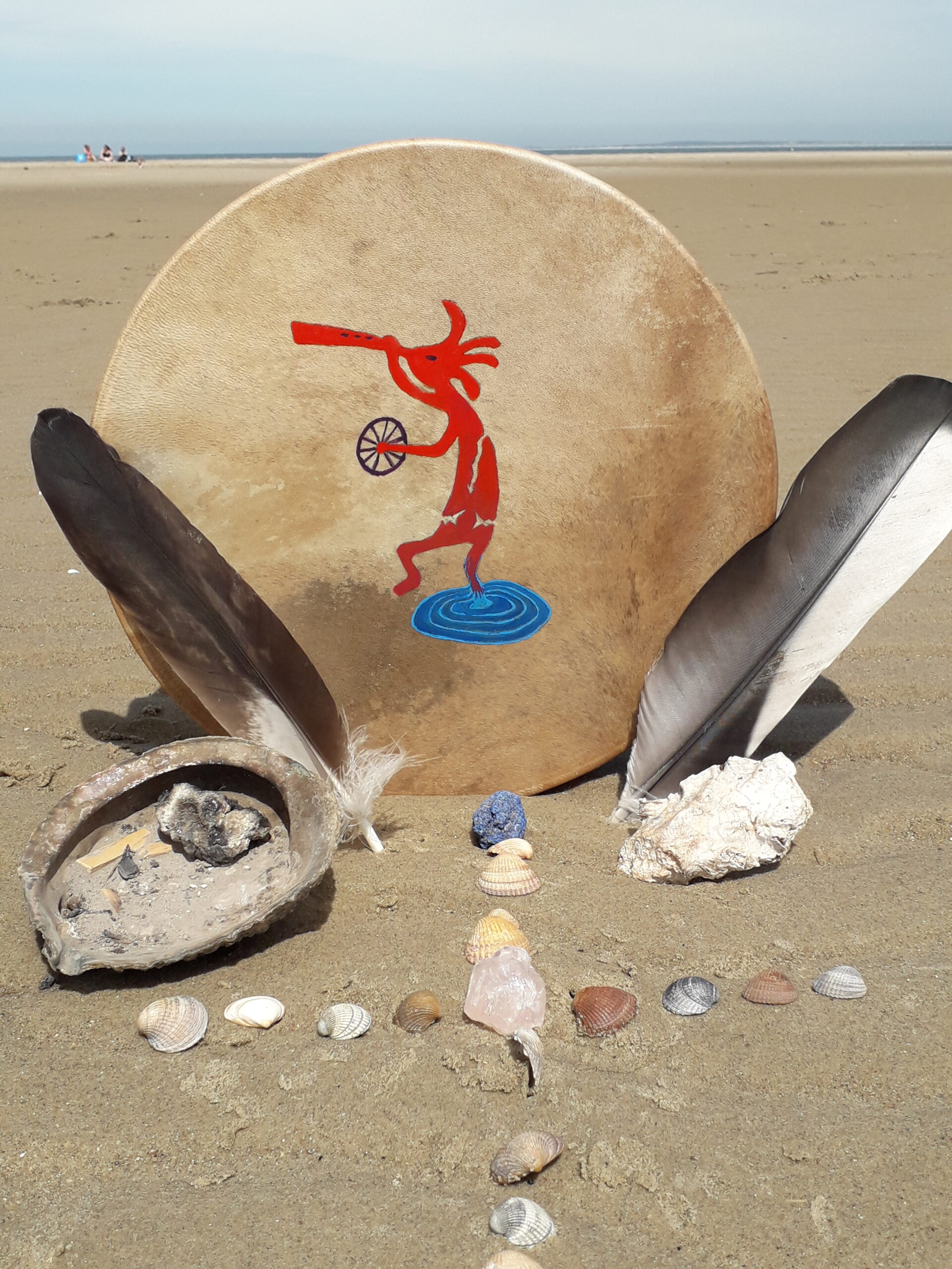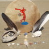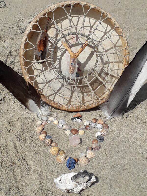 Birchwood frame and Pine Wood handle decorated with the traditional Medicine Wheel (4 Directions) symbol. Laced with hemp rope, measures 40×6 cm.