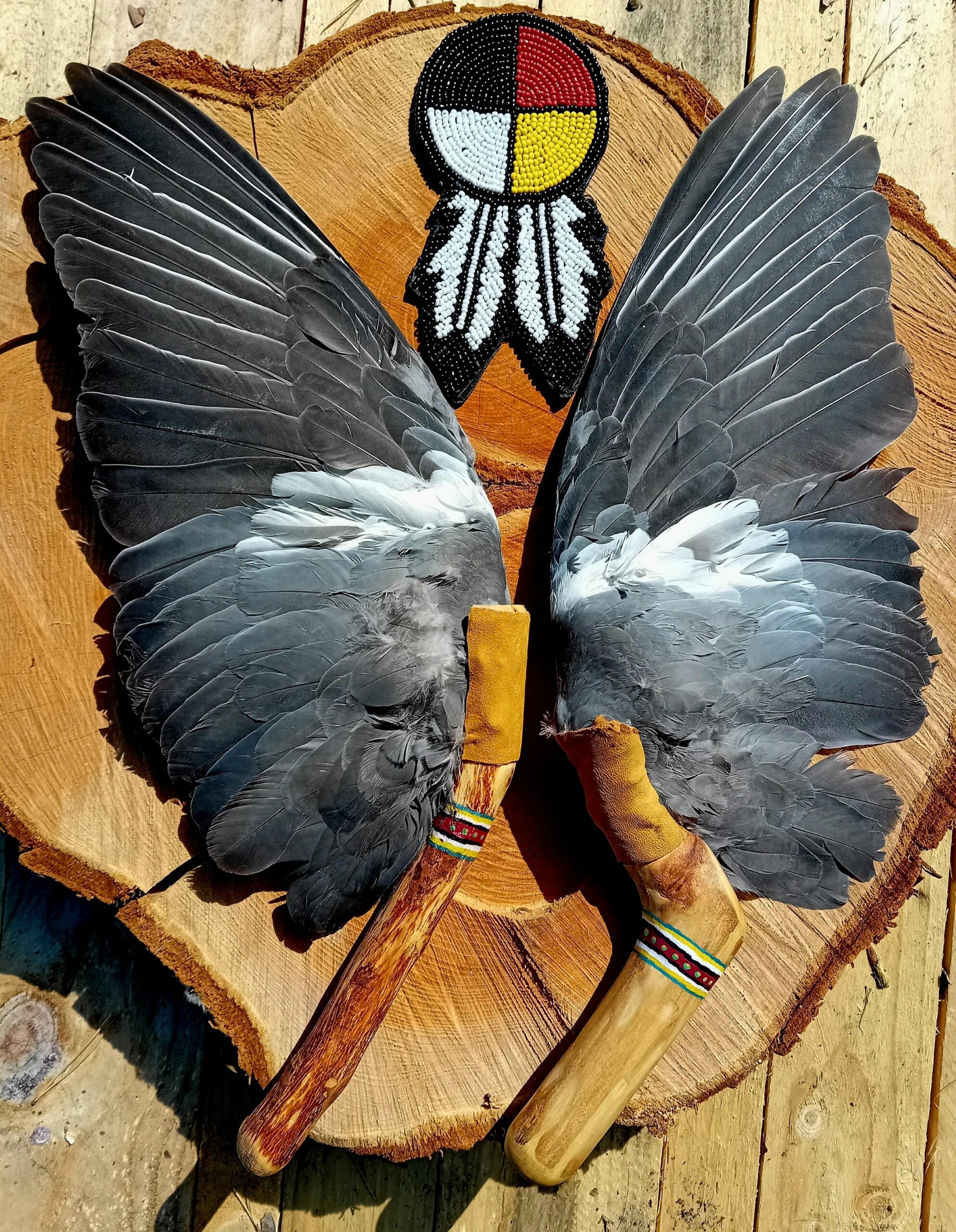 These Fans are made of traffic victims. Tabac is left at the finding spot and with respect these wings (or feathers) are transformed in an Energetic Tool, for Ceremonial use and to Honor the Winged Ones..